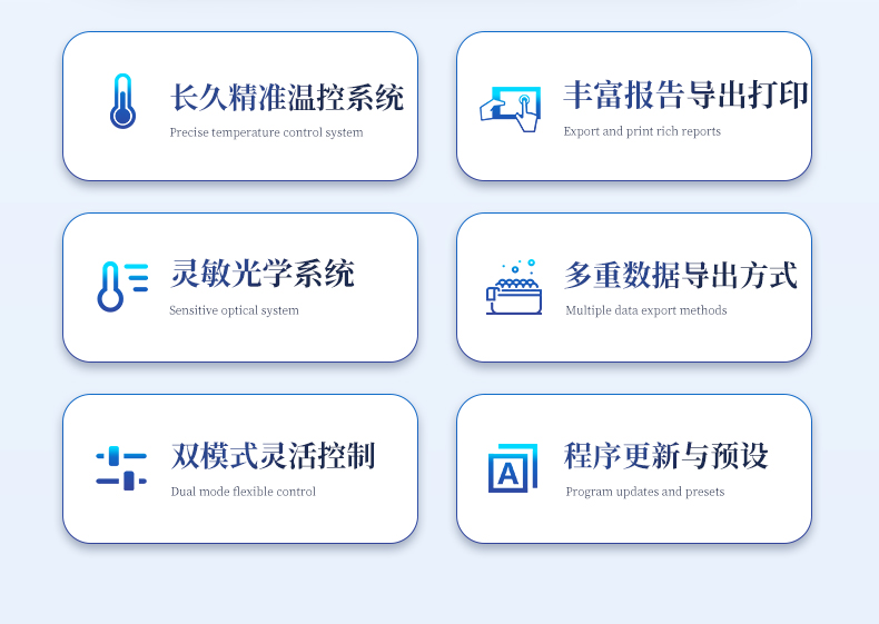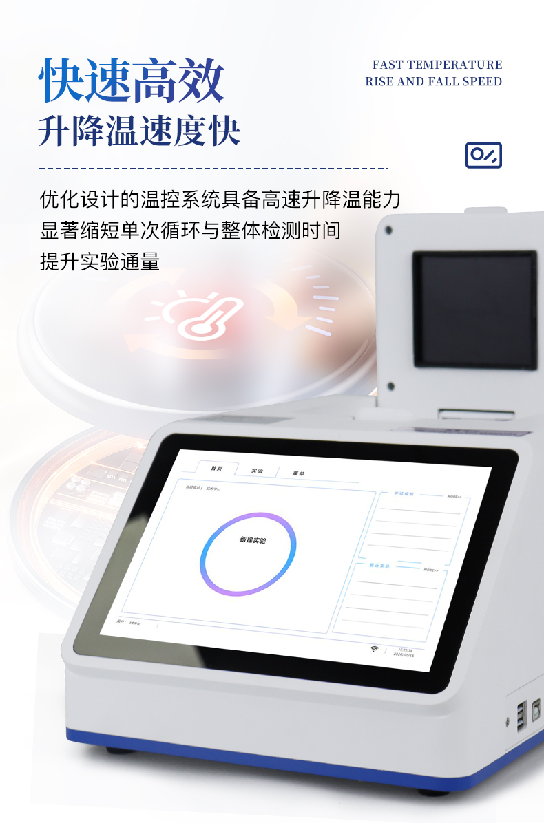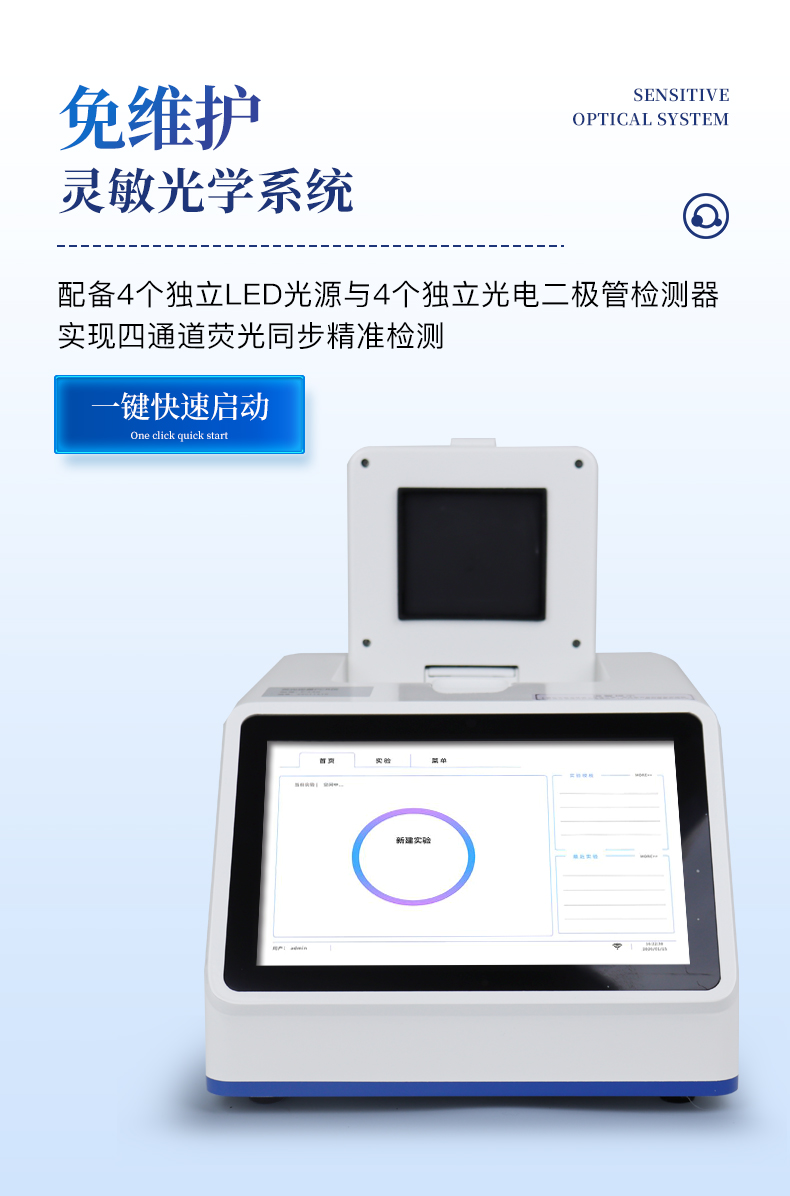 1.智能操作系统,实验尽在掌握A程序更新与预设:支持在线更新实验程序,并内置丰富的预设实验程序模板,用户亦可自定义保存常用模版,实现一键快速启动,极大提升操作效率。B操作简单:无论是触摸屏界面还是电脑软件,均设计得直观易懂,新用户也能快速上手。预置常用程序模板,进一步简化操作流程。2.精准稳定的温控与光学核心A长久精准的温控系统:采用进口***TEC半导体制冷模块,控温精准(±0.1°C),孔间温度均匀性**(≤±0.3°C)。系统稳定性卓越,长期使用性能衰减小,校准周期长达数年,显著降低维护成本与运营中断。B免维护的灵敏光学系统:配备单个独立LED光源与单个独立光电二极管检测器,采用超长寿命进口光源,设计寿命期内免维护,无需额外校准或更换,保障检测结果长期一致性与高灵敏度。C卓越的数据质量:实验线性相关性高(R2≥0.999),重复性优异(孔间CV值低),确保定量结果准确可靠,数据置信度高。 3.**便捷的数据与输出管理A多重数据导出方式:支持通过USB存储设备直接拷贝,或经由Wi-Fi无线网络传输数据至本地服务器或云端,方便灵活,满足各类实验室数据管理习惯。B丰富的报告导出与打?。褐С稚刹⒌汲龆嘀指袷剑ㄈ鏟DF、Excel)的实验报告。仪器兼容USB热敏打印机、蓝牙无线打印机及常规A4打印机,可直接在仪器上或通过电脑一键导出并打印专业报告,便于结果存档与即时分享。4.快速**与坚固耐用A升降温速度快:优化设计的温控系统具备高速升降温能力,显著缩短单次循环与整体检测时间,提升实验通量。B超长使用寿命:核心部件均选用工业级耐用材料与设计,整机运行稳定可靠,致力于为用户提供长久的投资回报。