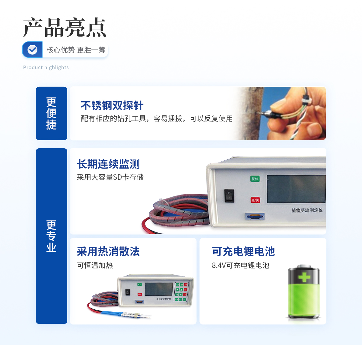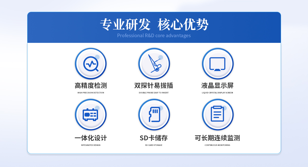 双探针,配有相应的钻孔工具,容易插拔,可以反复使用 采用热消散法,可恒温加热 可以长期连续监测 不锈钢探针,采用Teflon涂层,持久耐用 采用高精度T型热电偶直接与数据分析仪连接 采用大容量SD卡存储