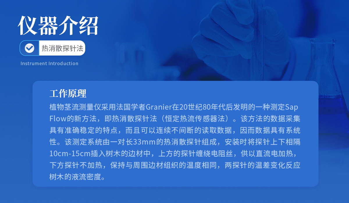 植物茎流测量仪采用法国学者Granier在20世纪80年代后发明的一种测定Sap Flow的新方法,即热消散探针法(恒定热流传感器法)。该方法的数据采集具有准确稳定的特点,而且可以连续不间断的读取数据,因而数据具有系统性。该测定系统由一对长33mm的热消散探针组成,安装时将探针上下相隔10cm-15cm插入树木的边材中,上方的探针缠绕电阻丝,供以直流电加热,下方探针不加热,保持与周围边材组织的温度相同,两探针的温差变化反应树木的液流密度。