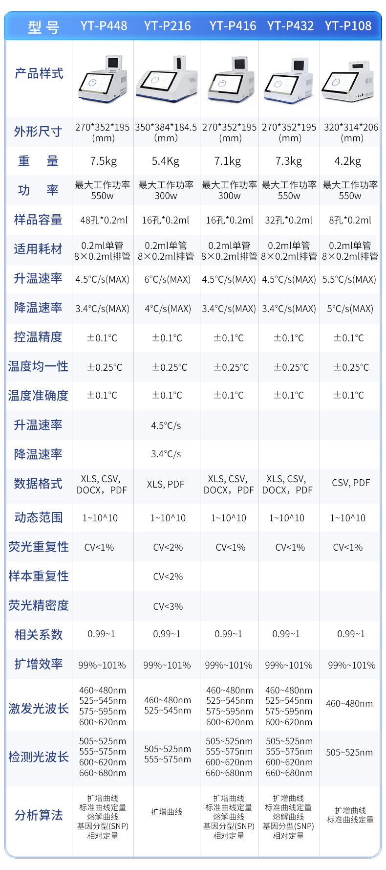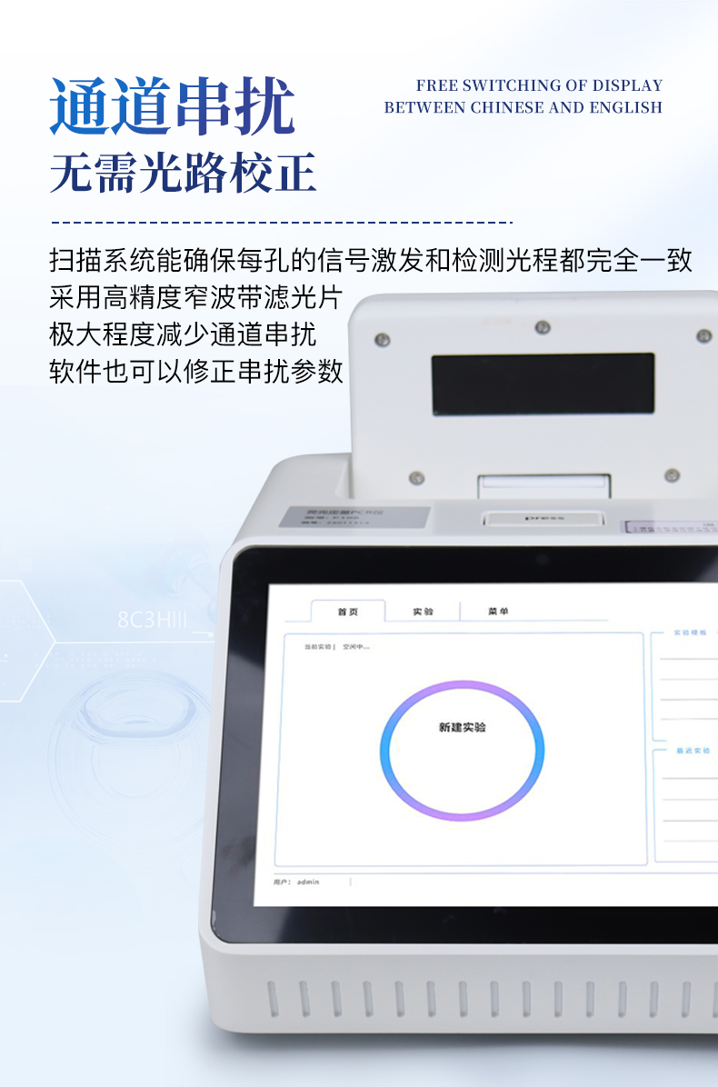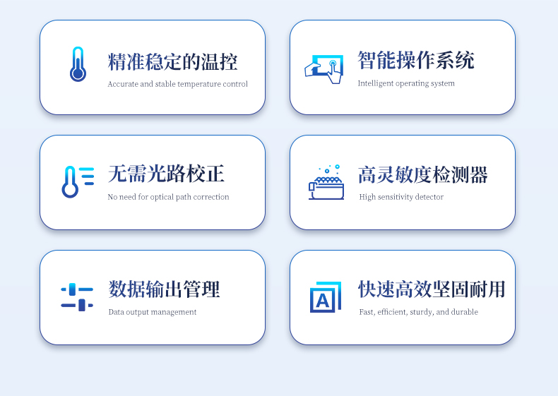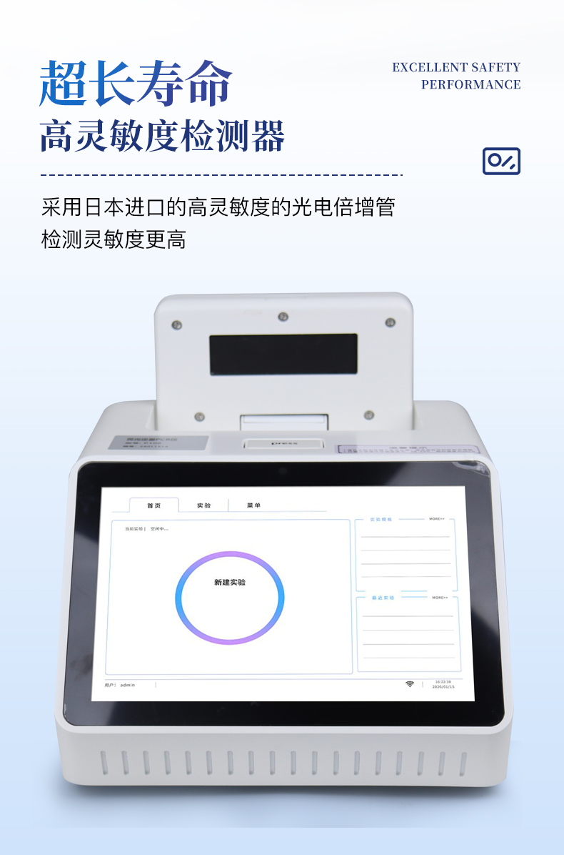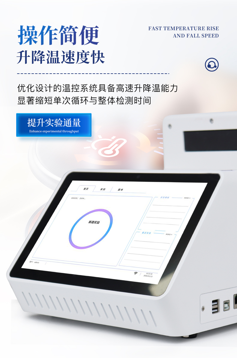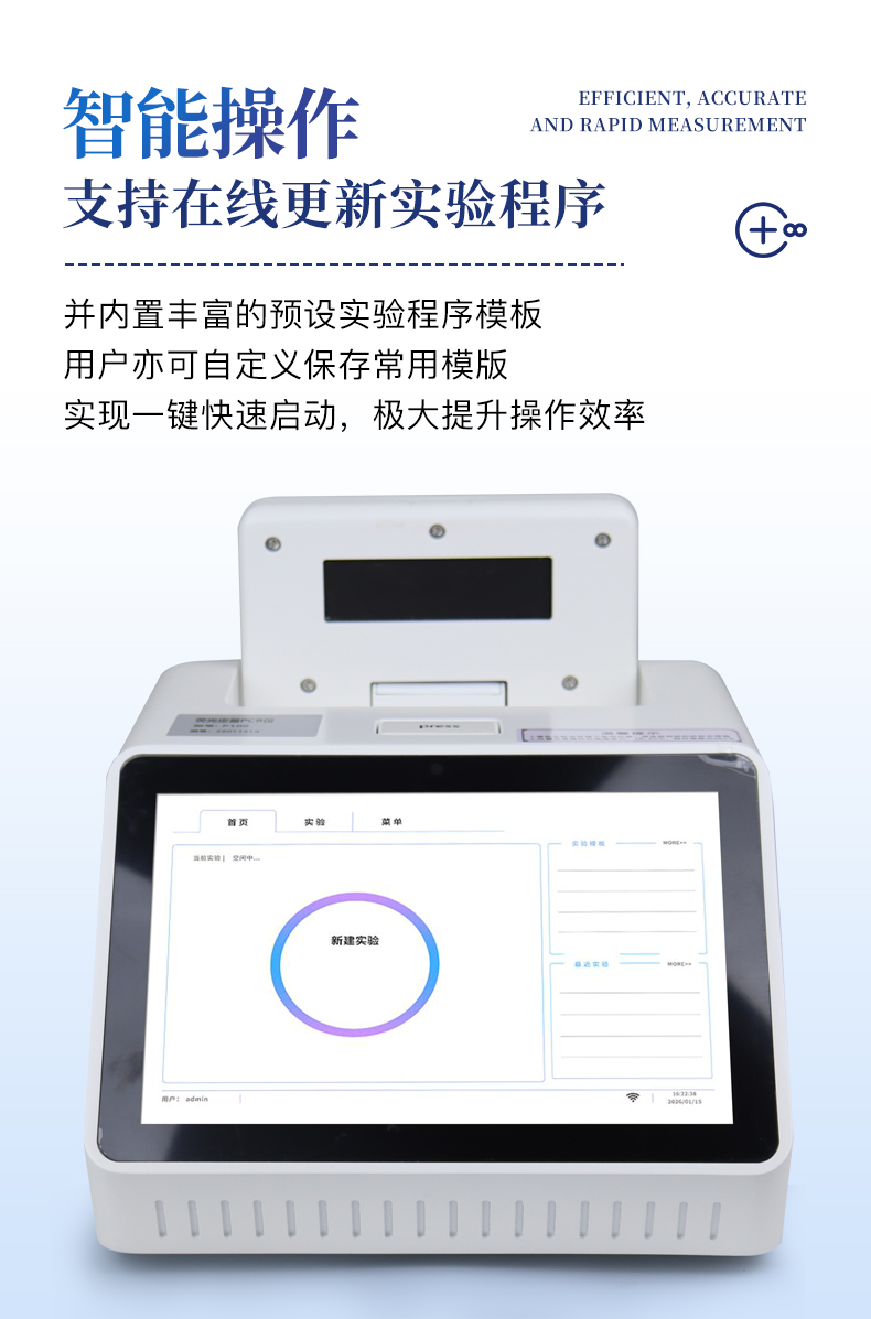 | 1.智能操作系统,实验尽在掌握 | A程序更新与预设:支持在线更新实验程序,并内置丰富的预设实验程序模板,用户亦可自定义保存常用模版,实现一键快速启动,极大提升操作效率。 | B极简启动体验(可选配):可定制集成摄像头扫描系统,用户只需扫描样品板或程序卡的二维码,即可自动识别并调用对应实验程序,简化流程,避免人为设置错误。 | C操作简单:触摸屏界面设计得直观易懂,新用户也能快速上手。预置常用程序模板,进一步简化操作流程。 | 2.精准稳定的温控与光学核心 | A长久精准的温控系统:采用进口***TEC半导体制冷???,控温精准(±0.1°C),孔间温度均匀性**(≤±0.3°C)。系统稳定性卓越,长期使用性能衰减小,校准周期长达数年,显著降低维护成本与运营中断。 | B免维护的灵敏光学系统:配备2个独立LED光源与2个独立光电二极管检测器,实现双通道荧光同步精准检测。采用超长寿命进口光源,设计寿命期内免维护,无需额外校准或更换,保障检测结果长期一致性与高灵敏度。 | C卓越的数据质量:实验线性相关性高(R2≥0.999),重复性优异(孔间CV值低),确保定量结果准确可靠,数据置信度高。 | 3.**便捷的数据与输出管理 | A多重数据导出方式:支持通过USB存储设备直接拷贝,或经由Wi-Fi无线网络传输数据至本地服务器或云端,方便灵活,满足各类实验室数据管理习惯。(可选配) | B丰富的报告导出与打?。褐С稚刹⒌汲龆嘀指袷剑ㄈ鏟DF、Excel)的实验报告。仪器兼容USB热敏打印机、蓝牙无线打印机及常规A4打印机,可直接在仪器上或通过电脑一键导出并打印专业报告,便于结果存档与即时分享。 | 4.快速**与坚固耐用 | A升降温速度快:优化设计的温控系统具备高速升降温能力,显著缩短单次循环与整体检测时间,提升实验通量。 | B超长使用寿命:核心部件均选用工业级耐用材料与设计,整机运行稳定可靠,致力于为用户提供长久的投资回报。 |