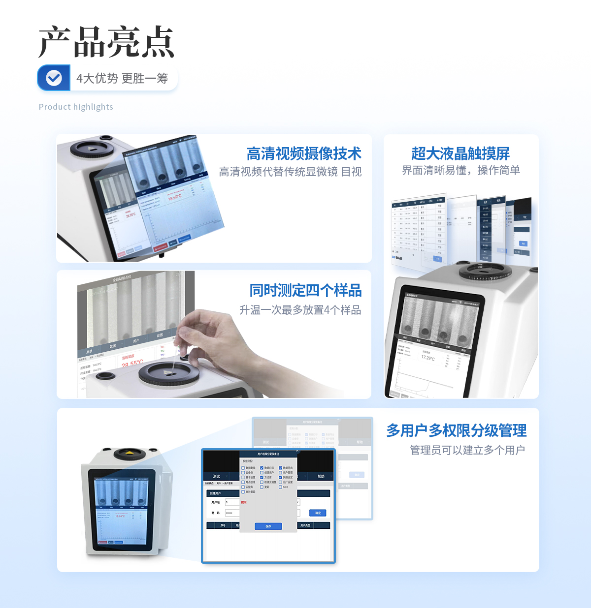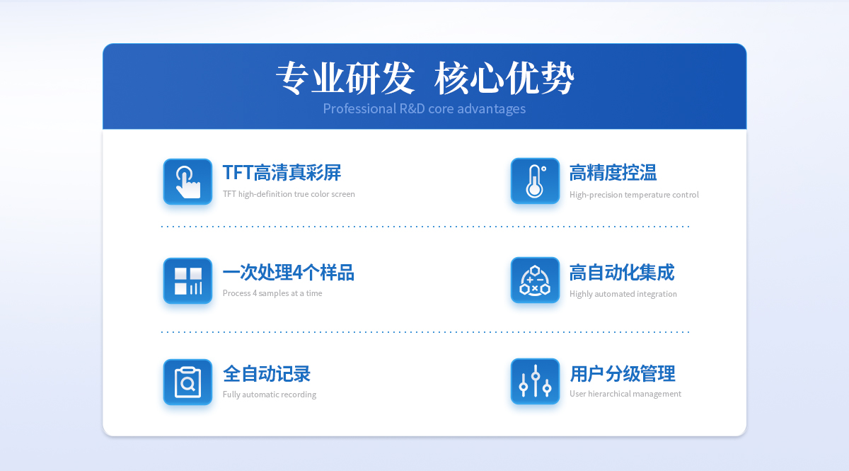 | 1、自动化集成,实现一键测定功能; | 2、一次处理4个样品; | 3、高清视频代替传统显微镜 目视高; | 4、全自动记录熔程,初熔,终熔; | 5、可通过打印机直接打印数据; | 6、符合21CFR Part 11、审计追踪、药典及电子签名; | 7、符合GLP要求规范。 |
