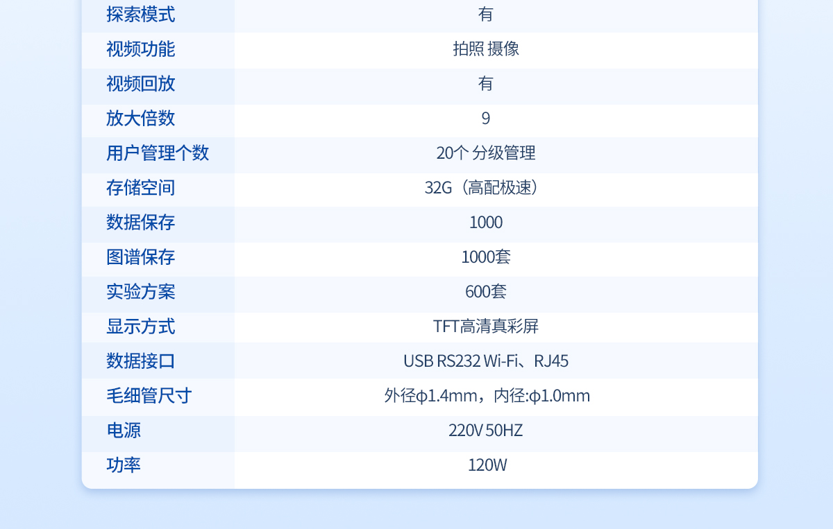 | 温度范围:室温-400℃ | 检测方式:全自动(兼容手动) | 处理能力:4个/批(同时可以做四个样) | 温度分辨率:0.01℃ | 升温速率:0.1℃--20℃ (200档 无极可调) | 控温方式:PID**控温 炉体全密闭设计 | 加热方式:电热块空气加热法 | 升温分辨率:≤0.1℃ | 升温速率::0.1℃/Min--20℃/Min | 准确度:±0.2℃(<200℃)、±0.4℃(>200℃) | 重复性:0.1℃/Min时熔点重复性±0.1℃ | 校正功能:具备 | 探索模式:有 | 视频功能:拍照 摄像 | 视频回放:有/有时间水印 | 高清摄像头:观察样品熔融状态 | 放大倍数:≥20 | 用户管理个数:500个以上 分多级管理 | 存储空间:64G硬盘,≥2G内存 | 试验方法:有 | 数据保存:有 | 图谱保存:300套 | 视频保存:有 | 内存扩展:可以 | 实验方案:500套 | 审计追踪:有 | 显示方式:不小于8寸高清彩屏 | 数据接口:数据接口:USB,网络WiFi接口,RS232 | 数据真实性:防篡改功能 | 数据导出:可用U盘导出 | 数据输出形式:PDF格式和EXCL数据 | 数据溢出提醒:提前自动提醒 | 打印机:选配 | 毛细管尺寸:外径φ1.4mm,内径:φ1.0mm | 电源:220V 50HZ 功率:120W |